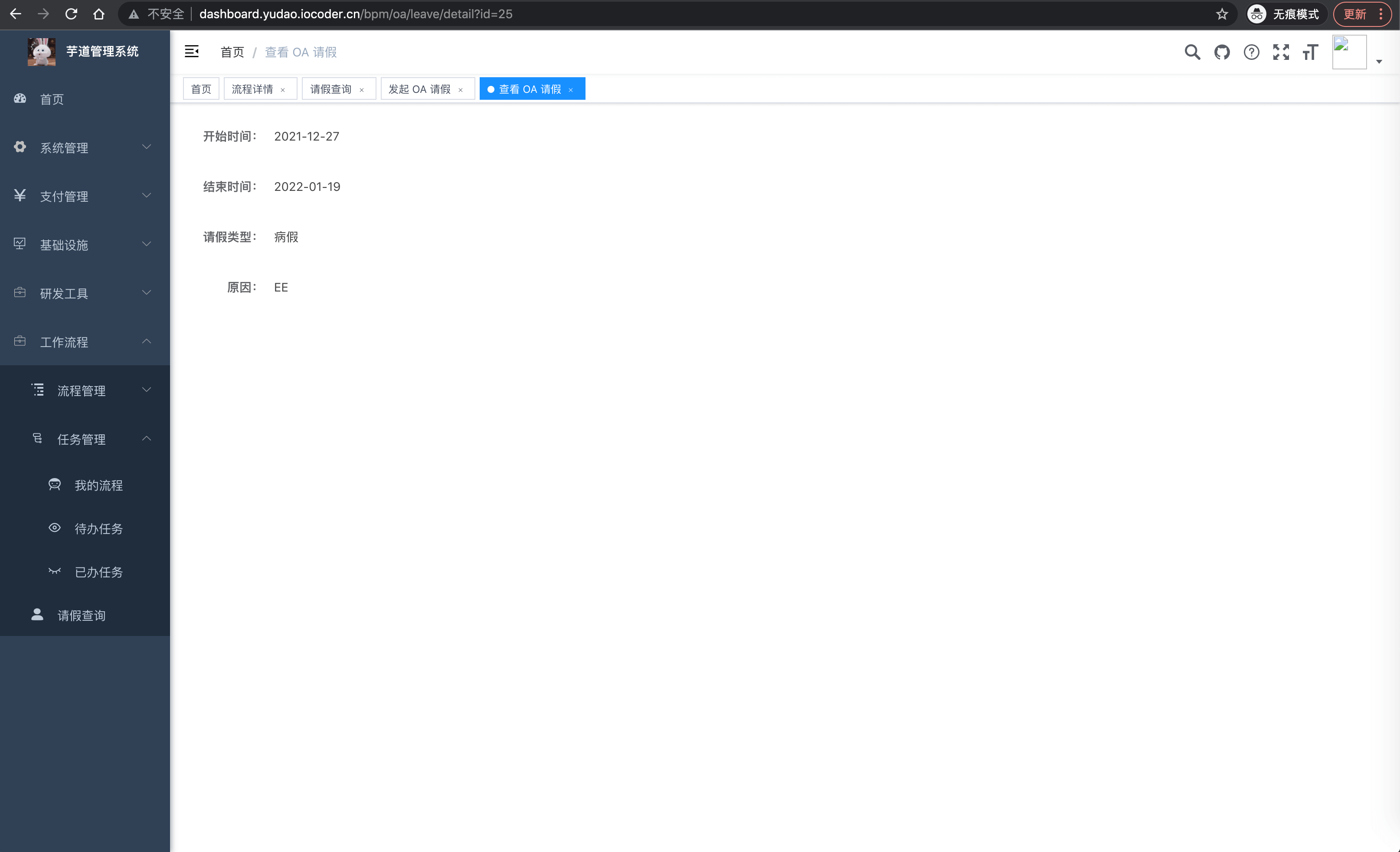 | 🚀 | OA 请假 | 作为业务自定义接入工作流的使用示例,只需创建请求对应的工作流程,即可进行审批 |