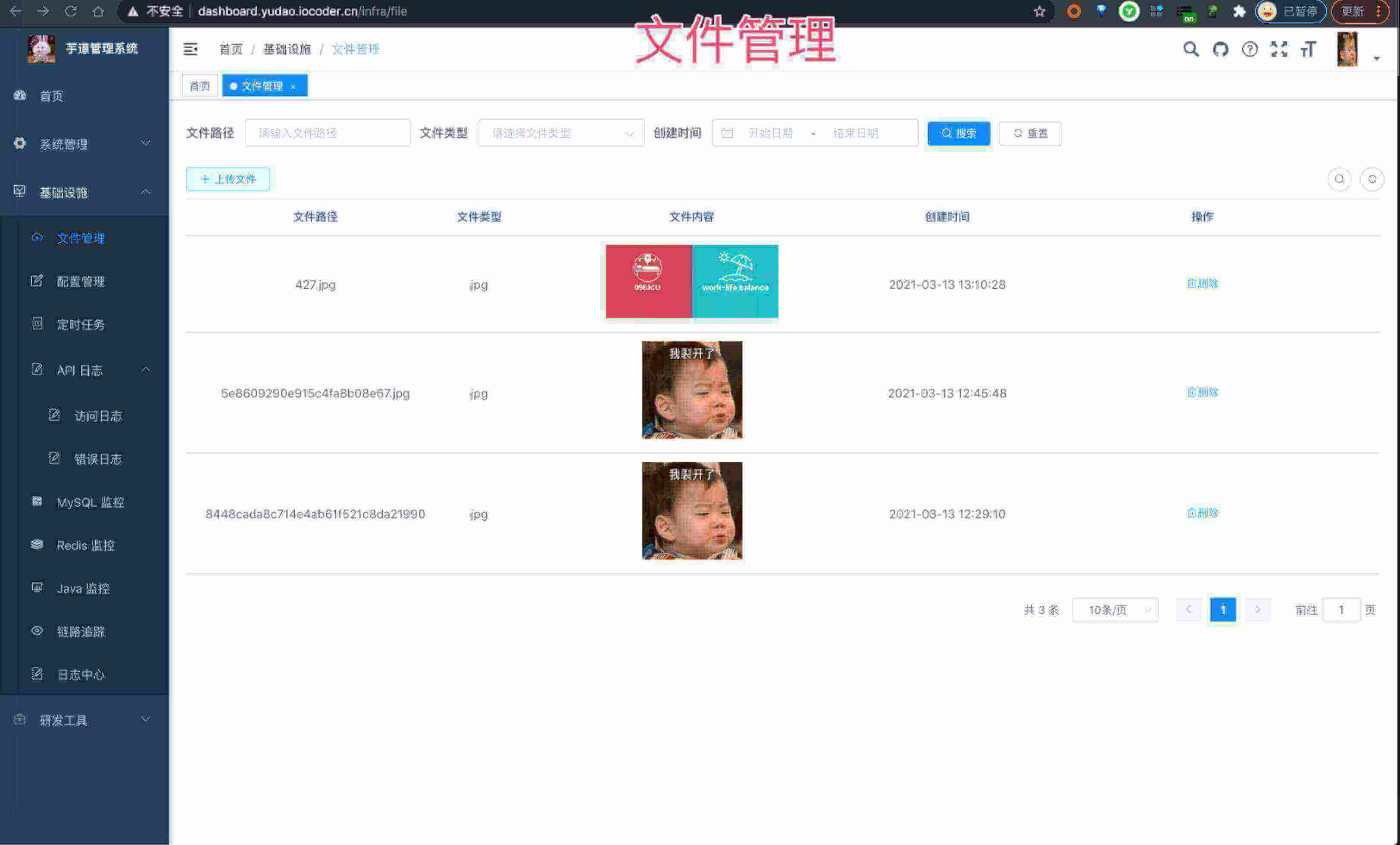 +| 监控平台          | ![Java监控](/.image/Java监控.jpg) | ![链路追踪](/.image/链路追踪.jpg)   | ![日志中心](/.image/日志中心.jpg) |